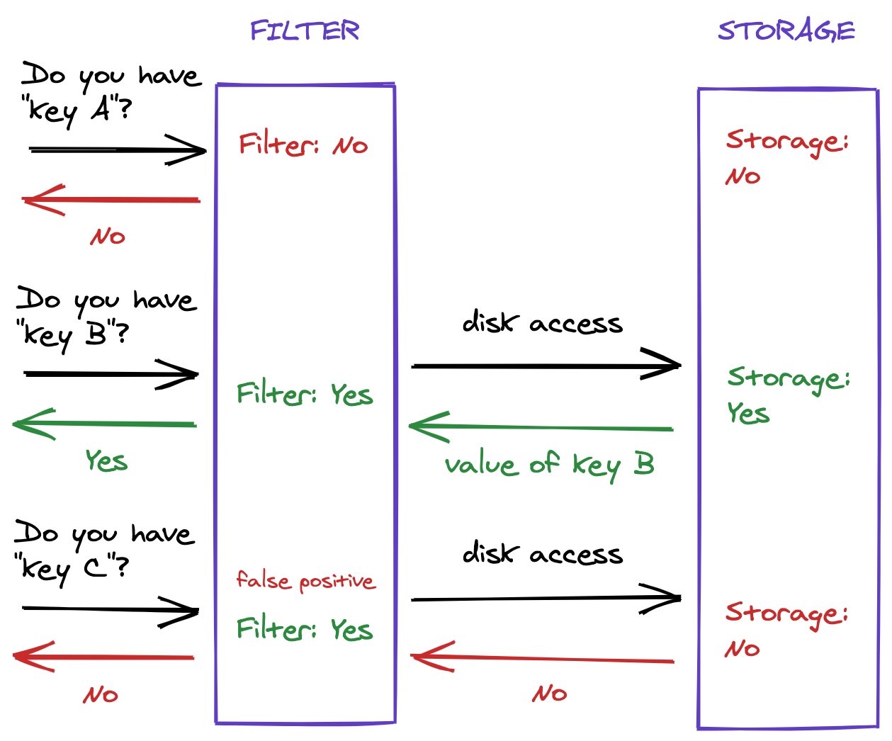 برعکس، اگر فیلتر بلوم مثبت شود، می‌توانیم به سادگی ذخیره اطلاعات را کنار بگذاریم و با آنچه در حافظه پنهان داریم کار کنیم، دسترسی بهتری به اطلاعات و در نتیجه صرفه‌جویی در منابع محاسباتی ارزشمند داریم.